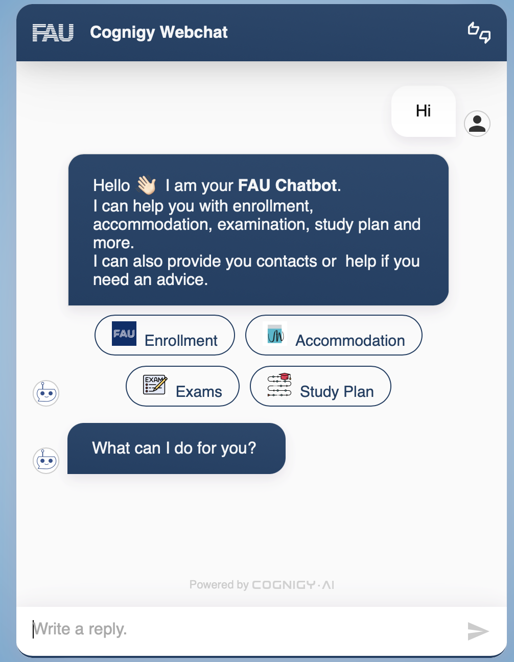 Chatbot project developed for the FAU website using the Cognigy coding platform. The main use case was a new student joining the university and going on about her issues when getting relavant information from FAU website and its different kinds of portals. This chatbot will address different student needs related to their program structure, accommodation, transport, health insurance or so by providing reliable answers from FAU databases.